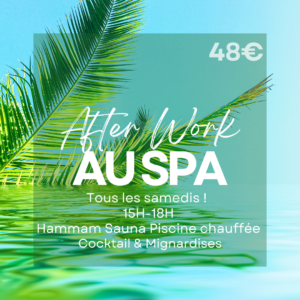 Après une longue journée, offrez vous une pause bien méritée avec notre After Work au Spa. Plongez dans une atmosphère de sérénité et de luxe, et laissez le stress de la journée s’évanouir.