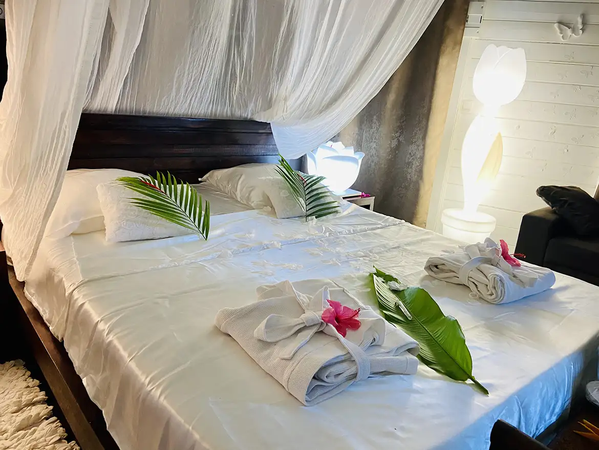 | Petit-déjeuner | 24h à l'avance | Pâtisserie Kreol ou sans gluten Œufs Bacon Fruits + Jus de fruits Boisson chaude | 20€ / personne |